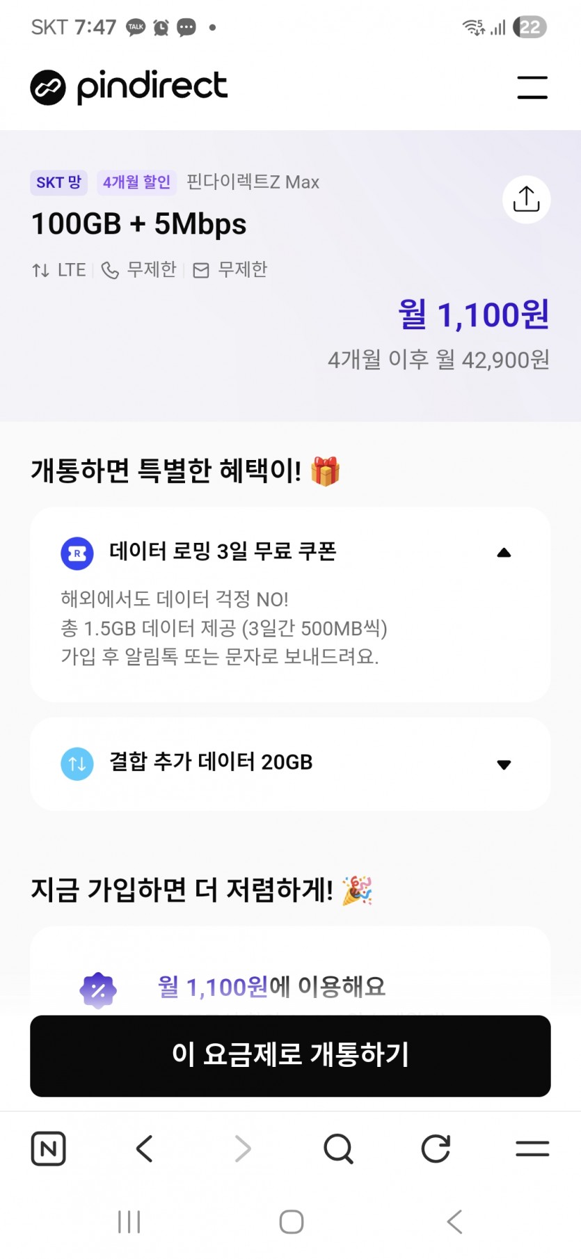 상품명핀다이렉트SK망 100기가+5MPS 1100원 4개월