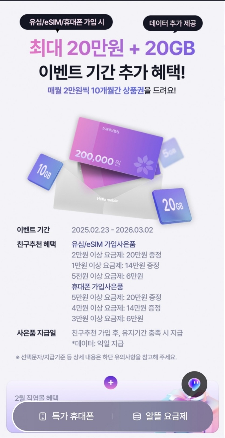헬로모바일 매달 상품권 20000원 10개월,쿠폰팩 5000원