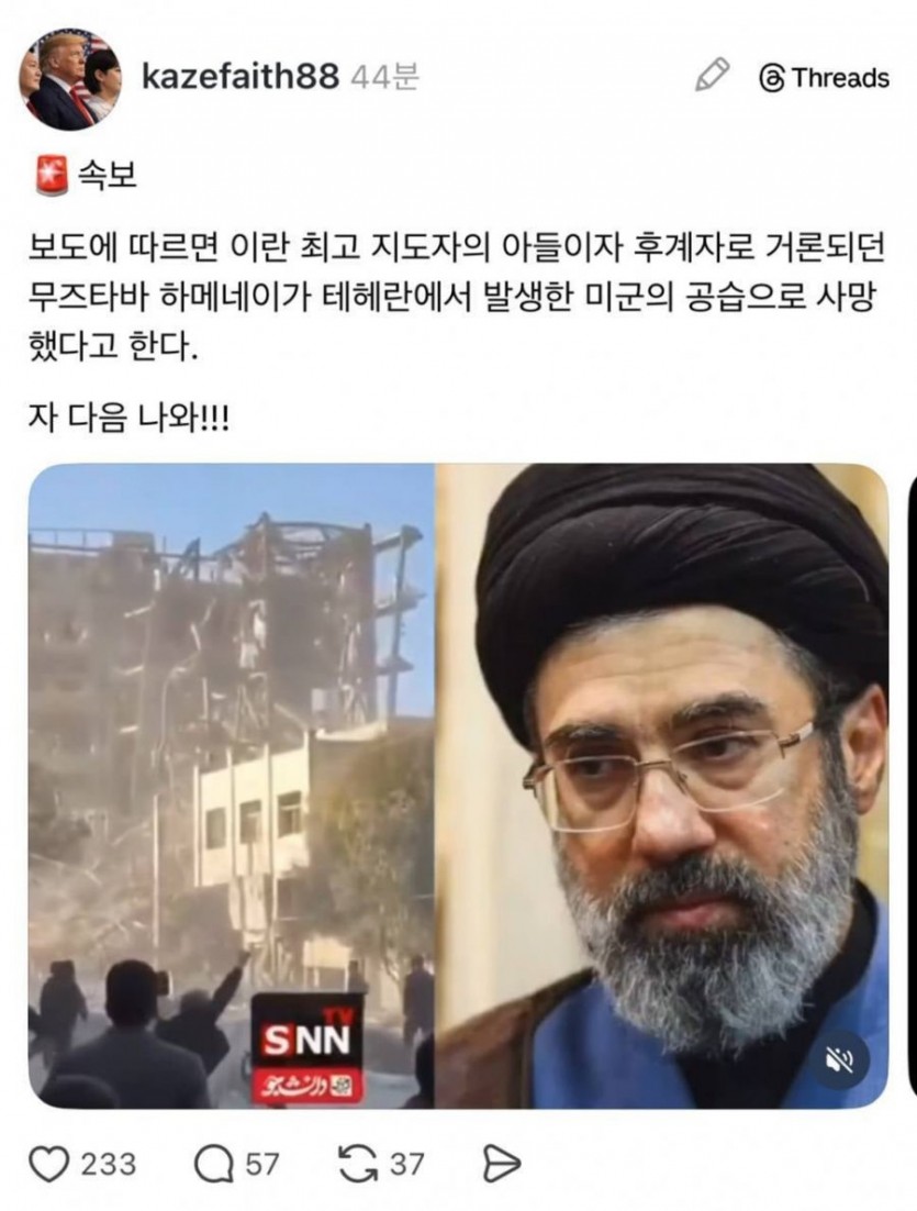 (속보) 하메네이 아들 사망 작성자 정보 81b20880 작성 작성일 2026.03.04 21:14 컨텐츠 정보 327 조회 0 추천 0 비추천 목록 본문 사망.. 0 추천 0 비추천 SNS 공유 관련자료 이전 BTS 공연 앞두고 갤럭시 대여 증가 작성일 2026.03.20 21:58 다음 속보) 이란 미친 사우디 아람코 시설 공격 ㄷㄷㄷ 작성일 2026.03.02 17:37 댓글 0 등록된 댓글이 없습니다. 로그인한 회원만 댓글 등록이 가능합니다. 목록