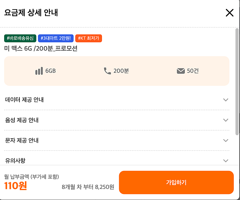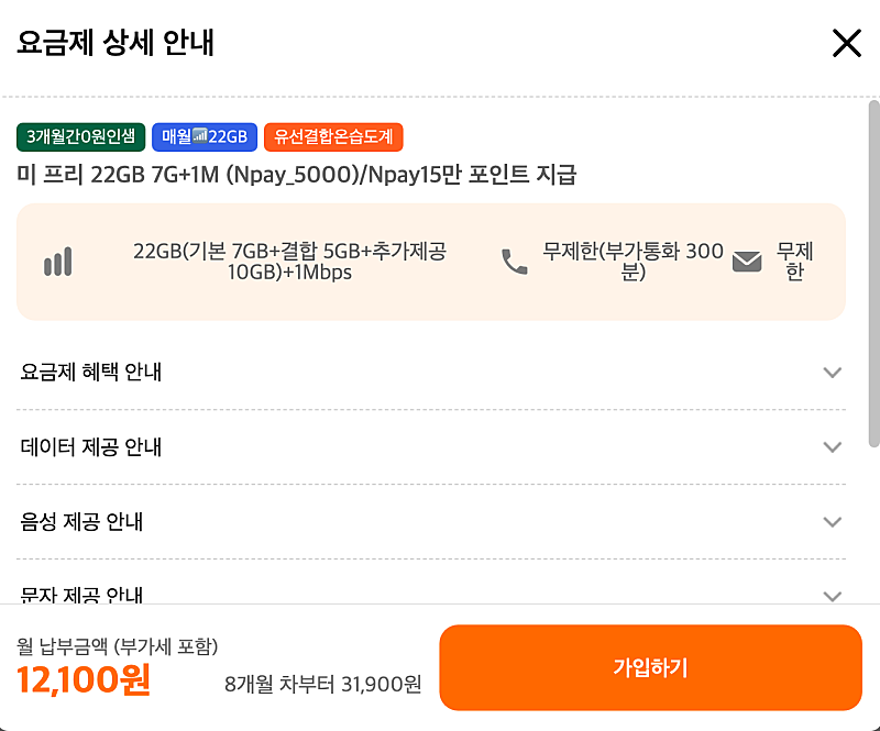 월 0원 3개월간 알뜰요금제 22GB+ 1Mbps